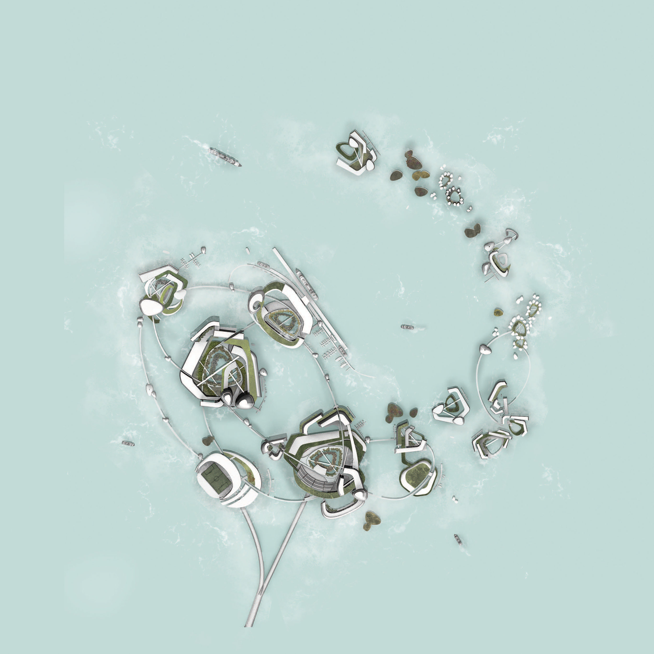 The proposed is a natural floating island chain that challenges the ecology of the ocean is explored through the lens of programming and differentiating between passive and active water ponds. We wanted to explore different notions of recreations which the landscape within each island follows a piazza format. The big organizational strategy is the main island clusters and the pedestrian and bike bridges that work as a secondary connection in our island.